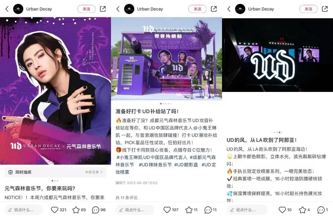 可以看到,Urban Decay想通过新生代音乐人小鬼引流其粉丝,再加上其又选择了声量较高的音乐节进行合作,两相叠加该品牌营销、宣传也在一定程度上实现了有效落地。