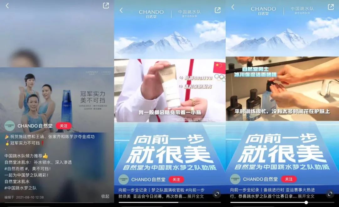 自然堂品牌与体育界的合作甚至更早,在2012年其就成为了中国跳水队的合作伙伴,至今已有十二个年头。在此期间,自然堂曾陪伴中国跳水队征战伦敦、里约、东京奥运会。当运动员们在赛场上取得优秀成绩时,自然堂会在社媒平台发布祝福动态。