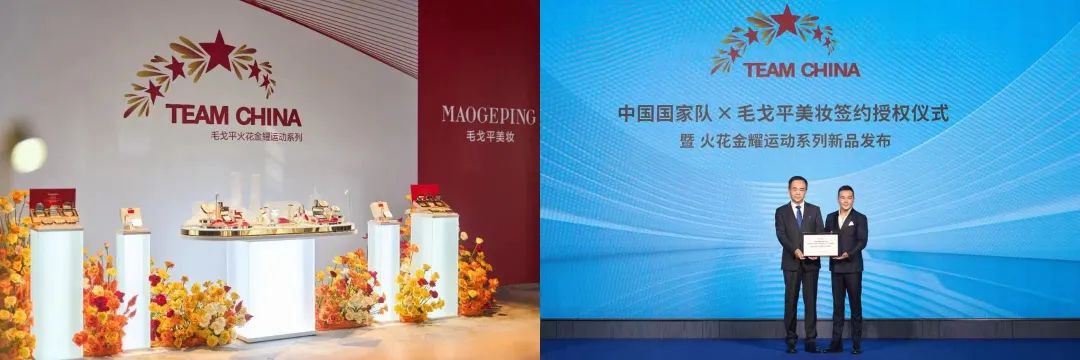不仅如此,今年9月,毛戈平美妆与TEAM CHINA正式签约,成为“中国国家队官方美妆服务供应商”,并发布了TEAM CHINA联名产品,即火花金耀运动系列。