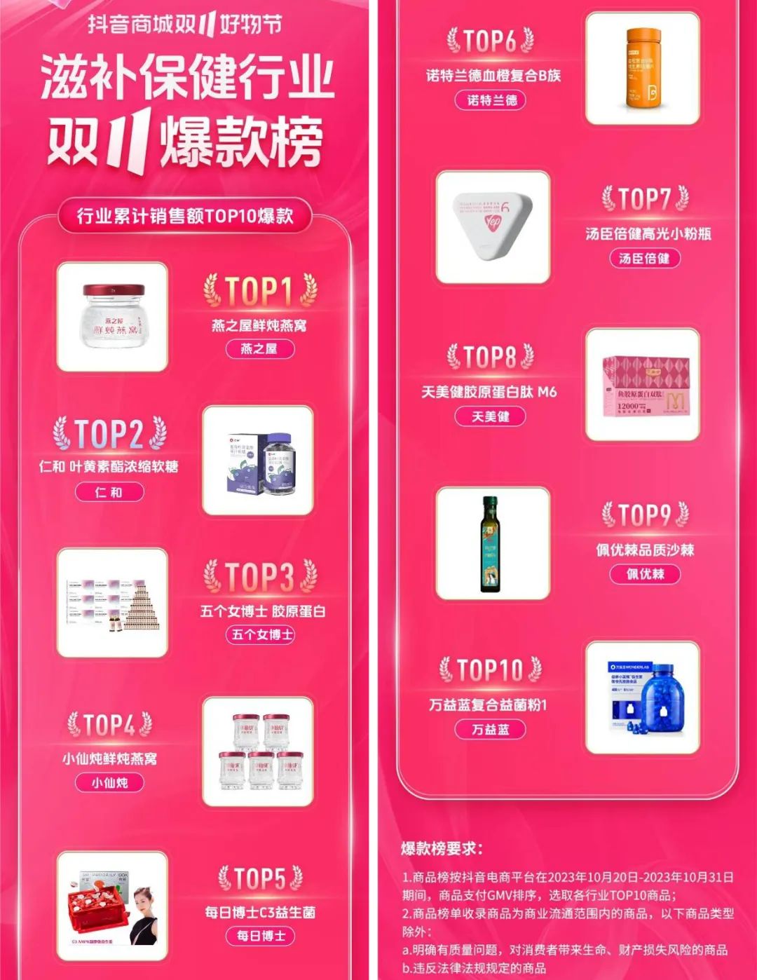 综合来看,年轻女性群体主要在为三大类产品买单,燕窝、益生菌、主打针对熬夜人群的保健品。在抖音双11滋补保健行业爆款产品的排名中,燕之屋鲜炖燕窝位列榜单首位,小仙炖鲜炖燕窝排第四位;每日博士C3益生菌、万益蓝益生菌粉也均有上榜;汤臣倍健主打的适用于25-40岁轻熟肌及熬夜肌人群的高光小粉瓶,排在第七位。