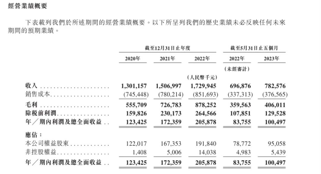 燕之屋招股书显示,2020年、2021年、2022年及2023年前5月,公司收入分别为13.01亿元、15.07亿元、17.30亿元、7.83亿元;毛利率分别为42.7%、48.2%、50.8%、51.9%。尽管毛利率颇高,但其对应的净利润仅分别为1.23亿元、1.72亿元及2.06亿元、1.01亿元。