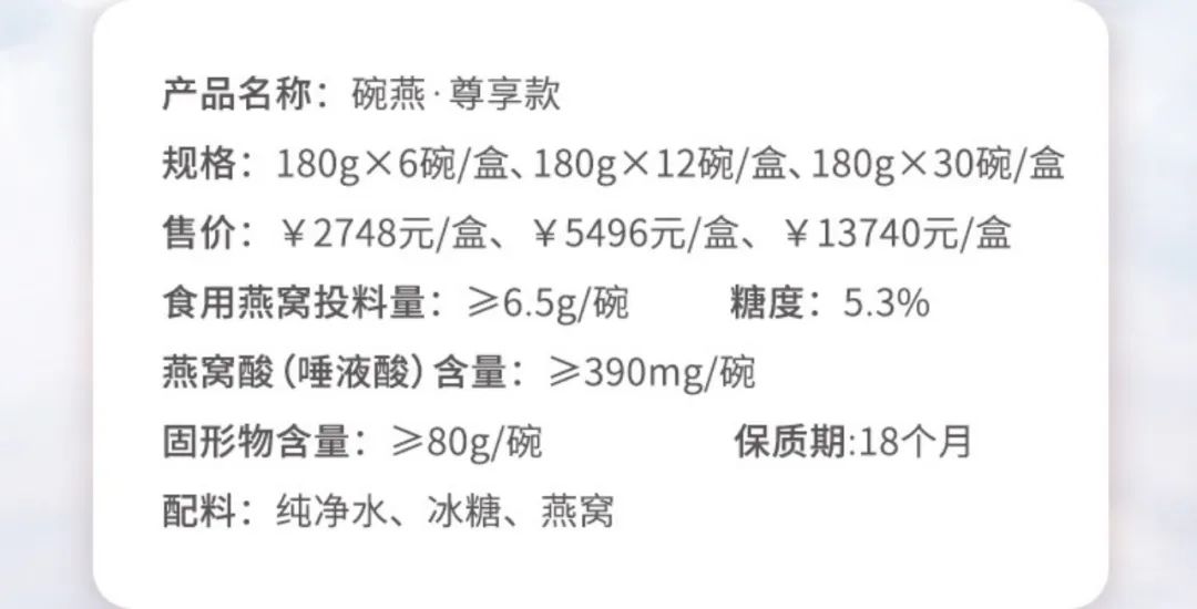 其中价格最贵的“碗燕·尊享款”,产品详情中写明食用燕窝的投料量为≥6.5g/碗,也就是说180g当中只有约3.6%是燕窝,458元实际是买了一小碗含有少量燕窝的“糖水”。均价378元/碗的浓鲜款,食用燕窝投料量更少,只有≥5g/碗。这还是售价较高的“碗燕”的情况,即食燕窝产品的燕窝含量更低。“趣解商业”查看天猫商城燕之屋官方旗舰店发现,月销5000+的冰糖即食燕窝,70g的产品中食用燕窝的投料是≥1.5g/瓶。品牌宣传中还特别写道“真燕窝,真敢标注投料量”,主打的就是一个“真诚”。