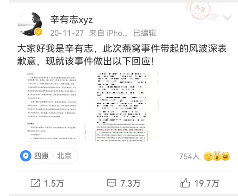 头两年,燕窝是直播带货争议的“焦点”。2020年,辛巴燕窝售假事件“名噪一时”,有消费者质疑辛巴徒弟直播间售卖的燕窝是糖水,辛巴因此被罚款、暂时封停直播间、承担退赔责任。去年,辛巴发长文讲述了此前卖假燕窝的争议事件,并指出包括刘畊宏在内的网红、明星均曾为争议燕窝品牌带货。消息一出,当即登上微博热搜,刘畊宏也被卷入舆论。