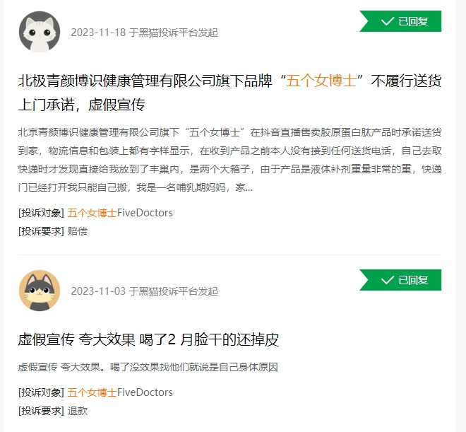 益生菌的效果好歹还被承认,胶原蛋白肽的争议就比较大了。多位消费者在黑猫投诉称五个女博士虚假宣传,其所宣传的“美白、抗老”等功效,实际上并没有效果,一些消费者服用后不仅没有变美,反而变胖、爆痘。