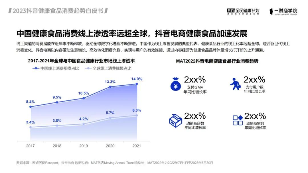 据抖音电商与一财商学院联合发布的《食养有方——健康食品消费趋势白皮书》(以下简称“白皮书”)数据,抖音电商上,健康食品消费的支付GMV、用户数和动销商品数,年同比增长率均超过200%(2022年7月1日至2023年6月30日)。