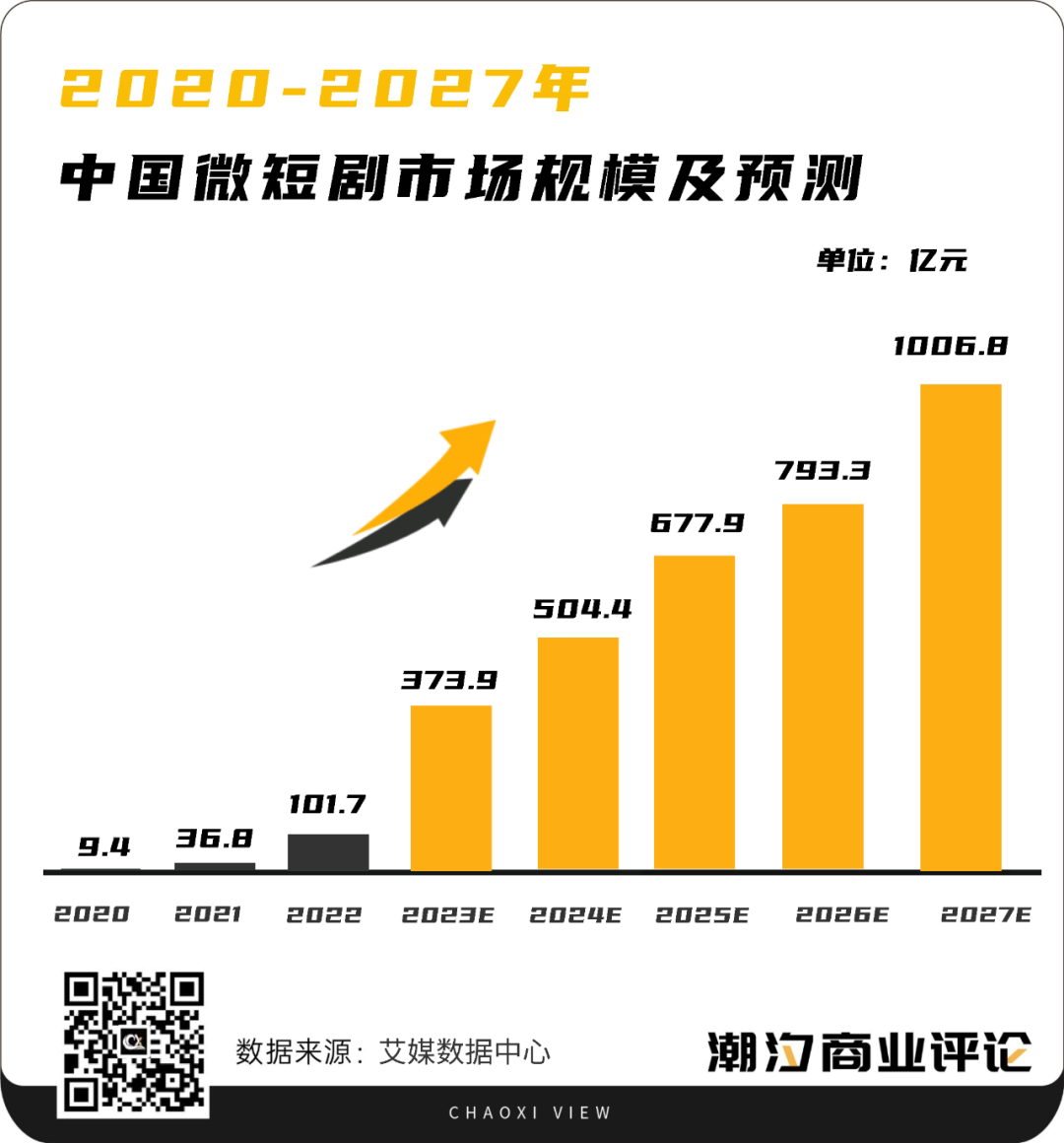 据艾媒咨询《2023—2024年中国微短剧市场研究报告》显示,2023年中国网络微短剧市场规模(包含行业用户付费、广告、版权等形式交易中产生的市场容量)为373.9亿元,同比增长267.65%,光是2023年第三季度中国网络微短剧发行量达150部,接近2022年全年总和的2倍。2027年中国网络微短剧市场规模将超1000亿元。