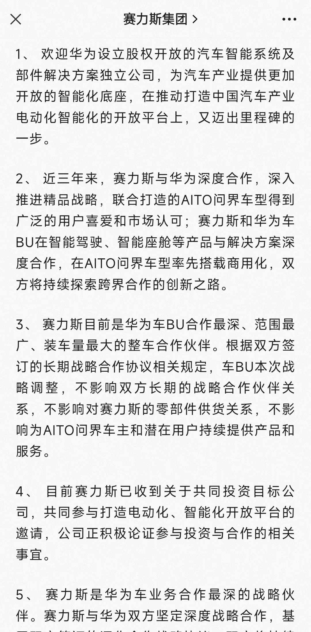 紧接着,赛力斯阐述了与华为车BU这些年的深度合作和友好伙伴关系,并且表示“车BU本次战略调整,不会影响其与华为车BU的长期战略伙伴关系,也不会影响AITO品牌供货关系、以及用户产品服务。”