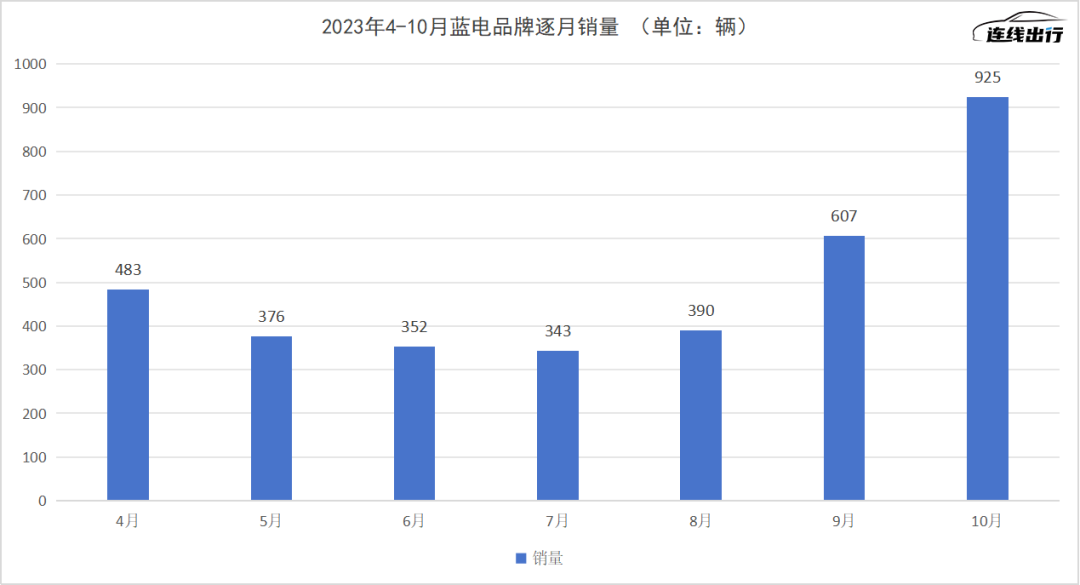 2023年4-10月蓝电品牌逐月销量,数据来源于乘联会,连线出行制图