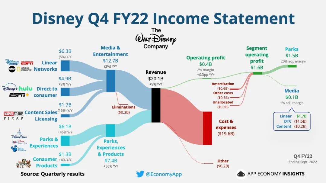 四季度迪士尼不光业务收入 YoY 有了5%的提升(从202亿美元提升到212亿美元),运营利润更是从16亿美元暴涨到30亿美元。