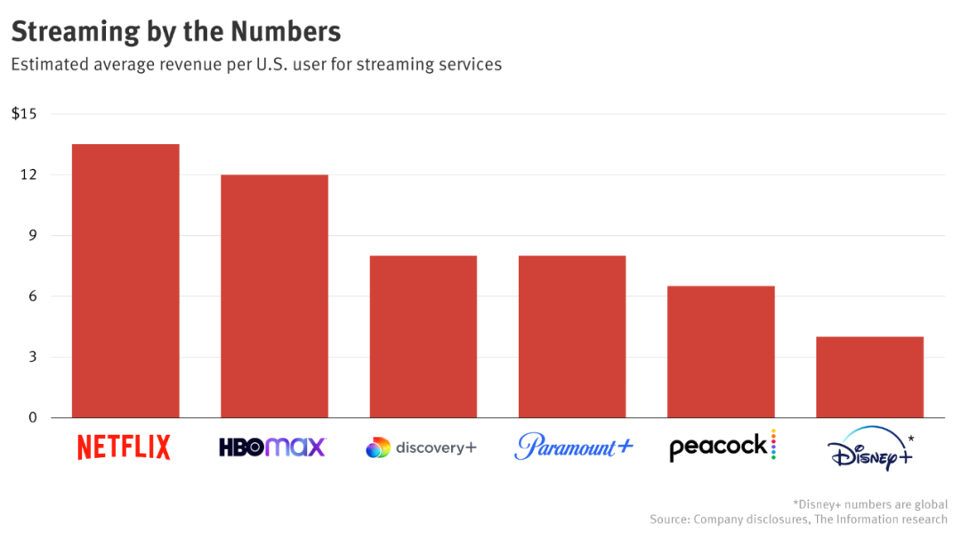 按照研究机构的统计,以低价开局冲击 Netflix 存量市场的 Disney+,虽然用户数发展很快,但户均价值远远落在了 Netflix 之后——Netflix 户均价值在13美元以上,而 Disney+ 的户均价值只有不足5美元,甚至还在所有的流媒体竞争对手如 HBO Max、Paramount+ 和 Peacock 之后。