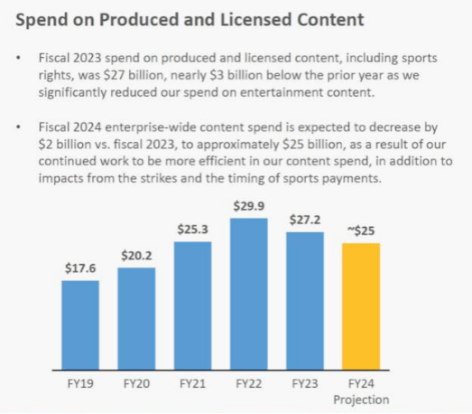 根据媒体披露,刚刚结束的2023财年,迪士尼的内容制作投资从2022财年的299亿美元减少到272亿美元,预计2024财年内容制作投资会进一步缩减到250亿美元。
