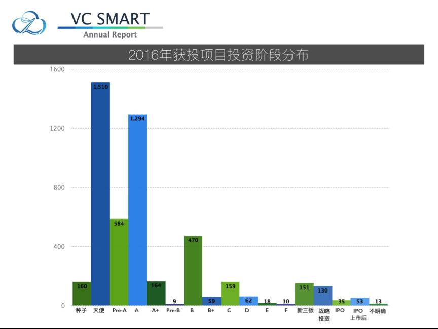 智投年报统计了2016年获投项目投资阶段分布,发现获得早期融资的项目要远多于获得中后期融资的项目, A轮之前(包括A轮)融资项目占到总数的72.69%,远远多于后几轮融资案例的总和。