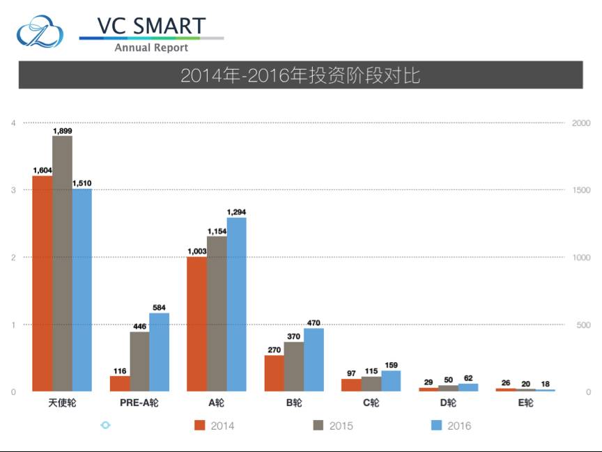 从整体上来看,2016年的轮次分布依旧同前两年一样均以早期项目为主,然而通过对比我们发现三年中,发生的融资数并未逐年显著上升,只有Pre-A轮及B轮和C轮的融资数相对前两年有所增加,这也与我们之前2016年创投市场进入冷静阶段的结论相符。