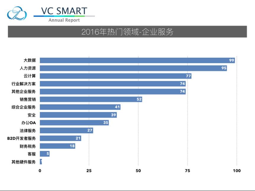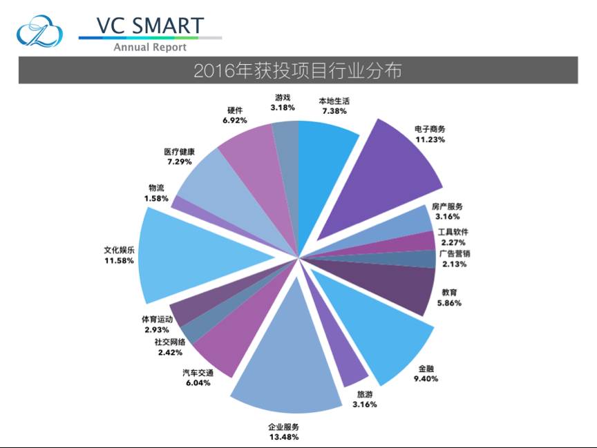 从数据可以明显地看到2016年融资事件主要集中在企业服务,电子商务,文化娱乐,金融,汽车交通,本地生活,医疗健康和硬件这个八个领域。