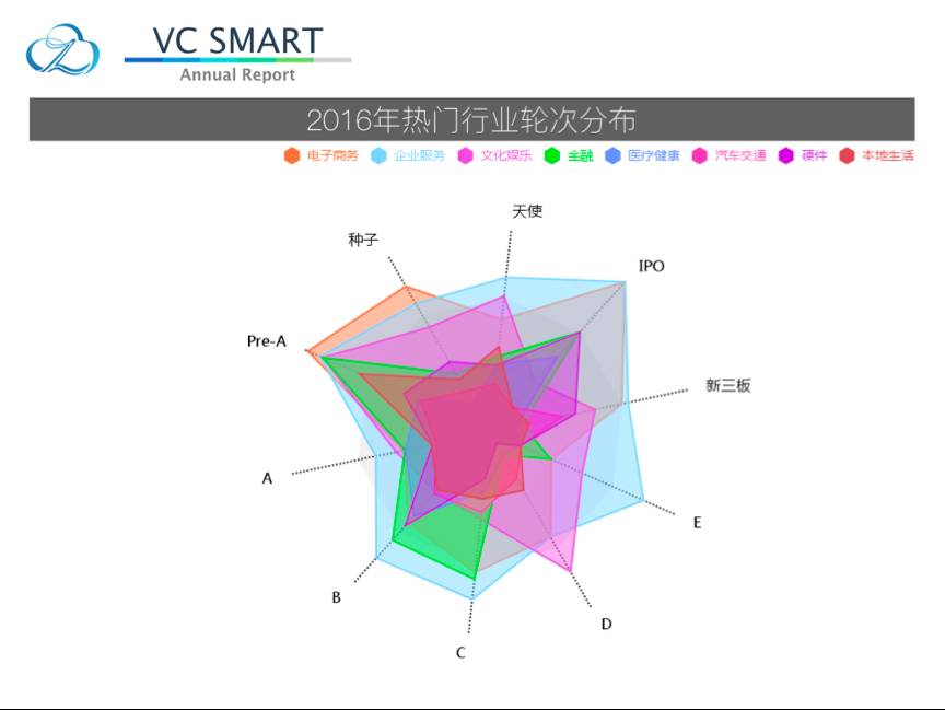 其他领域例如电子商务在轮次分布上更偏后期,表明了电商行业在互联网领域已经有相对较为成熟的公司,但其中也不乏新的竞争对手。