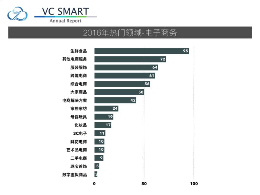 在电子商务领域,生鲜食品,其他电商服务和服装服饰是最受关注的细分领域。在生鲜领域,典型的融资事件包括获得超过一亿美元D轮投资的天天果园,由阿里巴巴,KKR投资C轮的易果生鲜,今年连续获得两轮融资的宋小菜以及由阿里巴巴内部孵化投资的盒马鲜生等等,可见资本市场对生鲜电商行业的十分看好,投注了数额不菲的投资。