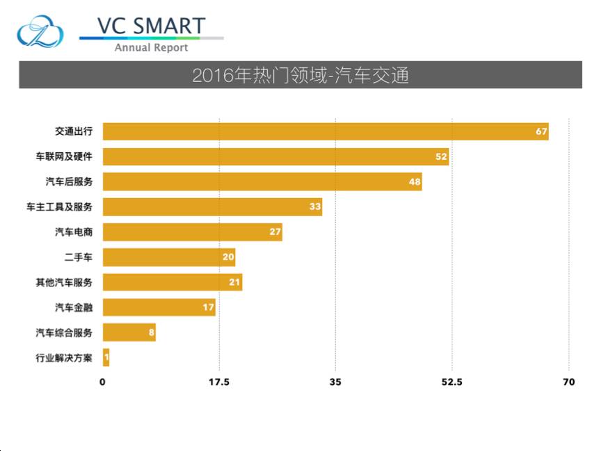 经过细分领域梳理我们发现交通出行,车联网及硬件,汽车后服务领域成为焦点,分别占到总投资事件的 22.79%,17.69% 和16.33%。可见资本市场对于汽车交通领域创业项目更多集中在消费频次高、客单价低、贴近日常生活的细分领域。