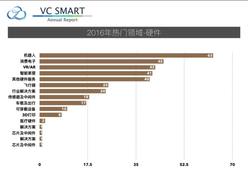 2016年机器人领域的融资事件在硬件行业中排行第一。AlphaGo今年3月以4:1的比分击败了世界围棋冠军李世石,人工智能的取胜证明了当下的人工智能已经可以像人类一样进行「思考」。