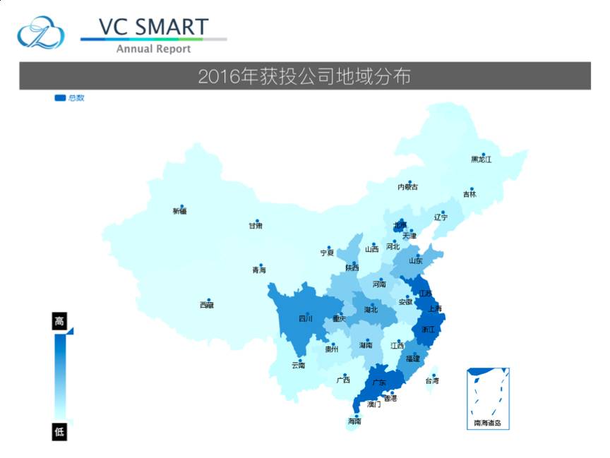上图为这一年新成立的创业公司数量全国分布热图,可以看到,北京、上海、广东(包括深圳),浙江依旧占据主力地位。