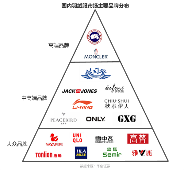 目前国内市场大致划分为:国际品牌Canada Goose和Moncler占据高端市场;波司登独揽中高端市场;鸭鸭、雪中飞等专业羽绒服品牌与优衣库、海澜之家为代表的全品类服饰品牌瓜分大众市场。
