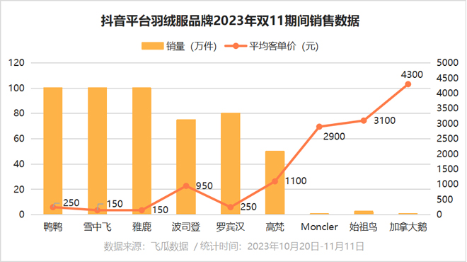 今年国产中低端羽绒服品牌大热,500元以下的产品销售火热。相较于羽绒服“天花板”们,这些定价友好的“县城羽绒服”在电商渠道创造了销量新高。如YAYA鸭鸭、雪中飞、高梵、雅鹿等,都在今年抖音商城双11期间卖出不错的销售成绩。鸭鸭、雪中飞、雅鹿均在双11期间卖出超100万件,平均客单价低于300元。