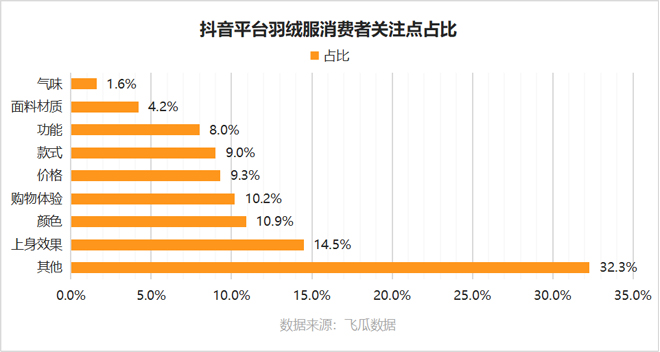 值得注意的是,抖音平台上消费者购买评价关键词中,占比排名前几名的分别为【上身效果】的关注占比14.5% ;【颜色】占比10.9%;【购物体验】占比10.2%,【价格】占比9.3%。发现消费者对羽绒服产品价格与穿着效果的敏感度高,大部分消费者更注重性价比。