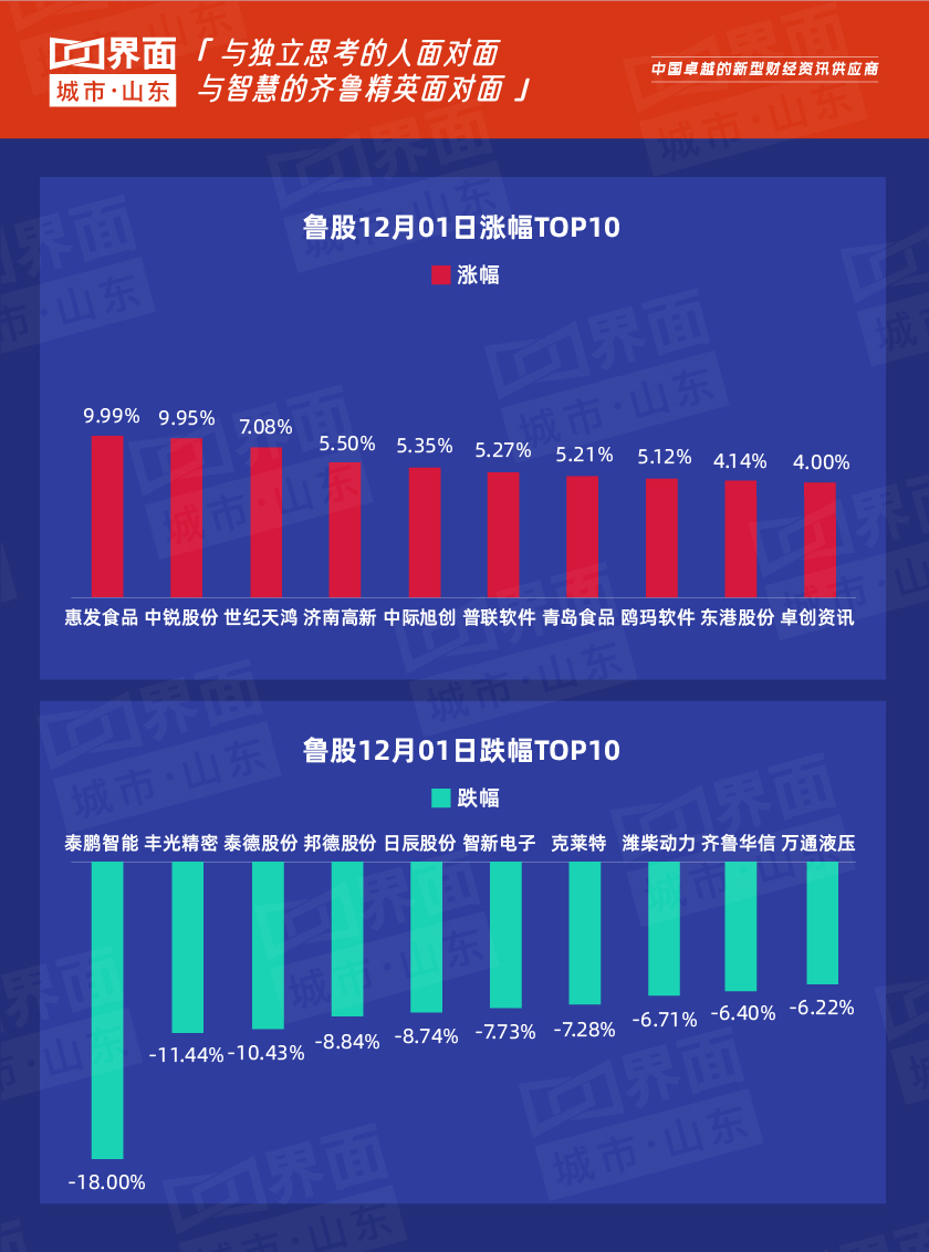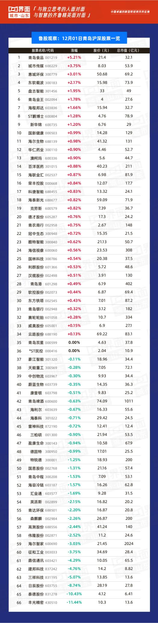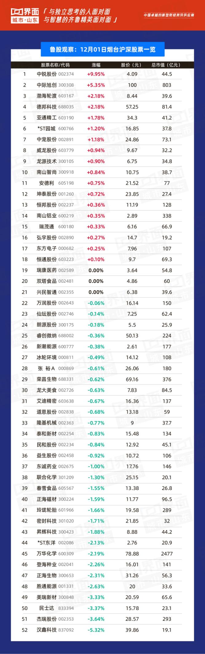 12月1日,山东省内沪深股票有150只个股上涨,144只个股下跌;总市值过千亿的有万华化学(600309)、海尔智家(600690)、兖州煤业(600188)、青岛啤酒(600600)、中航沈飞(600760)、山东黄金(600547)、潍柴动力(000338)共7家,500亿-1000亿的共有6家,分别是中际旭创(300308)、歌尔股份(002241)、华鲁恒升(600426)、浪潮信息(000977)、华电国际(600027)、中泰证券(600918)。