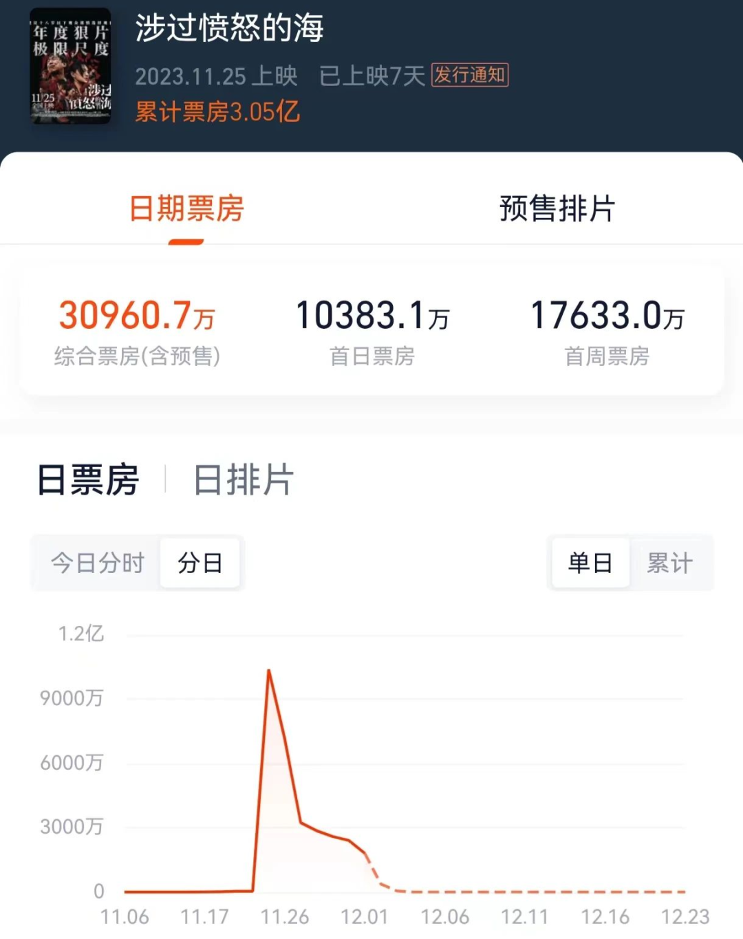 所幸的是,在贺岁档之前,这部《涉过愤怒的海》稍微填补了平淡市场的空缺,影片总票房预测已经要逼近7亿元,这对于一部作者型影片而言已属胜利。