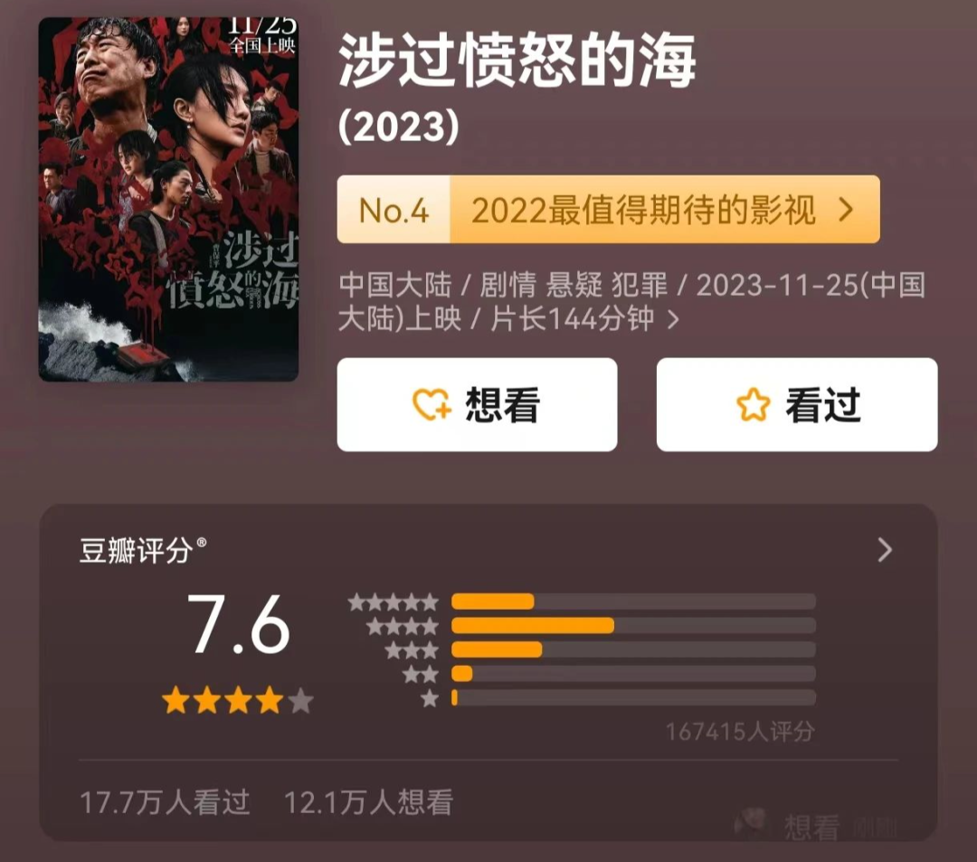 然而,从目前的成品检验来看,《涉过愤怒的海》豆瓣评分已从开分的7.8分落至7.6分,坊间的情绪并不单一趋同,反而充满争议。