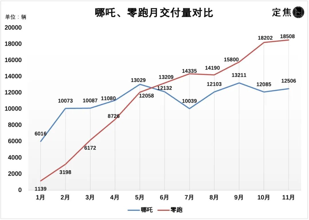 哪吒是去年造车新势力的销冠,今年增长乏力。过去半年,哪吒的月交付量几乎没有增长,11月交付12506辆,不仅落后于蔚小理,更是不如零跑、极氪。