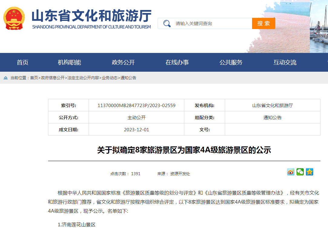 12月1日,山东省文化和旅游厅官网发布“关于拟确定8家旅游景区为国家4A级旅游景区的公示”。