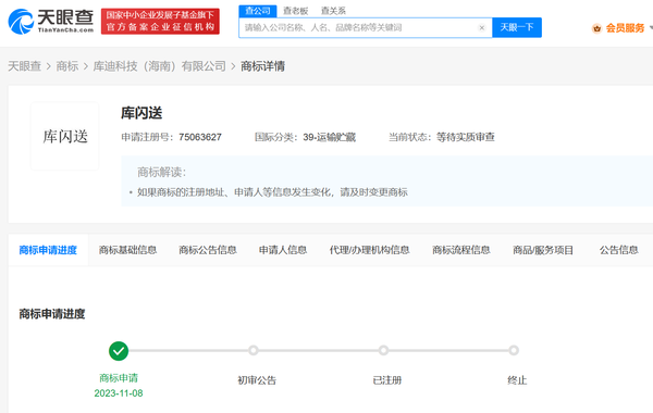 天眼查App显示,近日,库迪科技(海南)有限公司申请注册两枚“库闪送”商标,国际分类为运输贮藏、科学仪器,当前商标状态均为等待实质审查。(天眼查)
