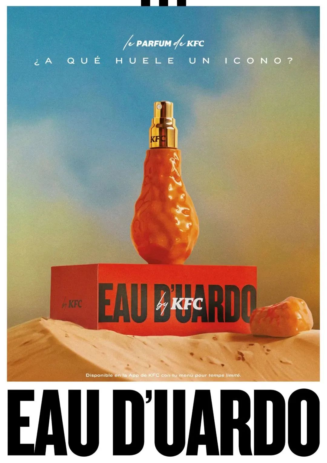 日前,西班牙肯德基宣布将推出一款与众不同的限量版香水「Eau D’uardo」。香水瓶身设计以其标志性的炸鸡腿为主体造型,但香味将天竺葵的香调与柑橘的清新香气融合在一起,并点缀粉红胡椒和佛手柑。其灵感源自于肯德基原始配方中的11种草本植物和香料。这款限量版香水仅在西班牙当地肯德基餐厅及线上应用程序可以购买。(GrayDesign)