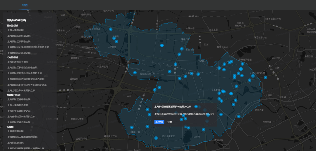 可视呈现,助力改进提升。全面推进养老机构“一院一档”项目,平台数据涵盖服务安全,服务提供和服务保障等维度,涵盖食品、消防、护理、康复、运营等内容。将普陀区养老机构服务质量以数字化的形态呈现,通过3D的地图视觉效果将全区养老机构和长者照护之家以街道区划动态图形形式展现。根据大数据结果自动呈现养老机构整体服务趋势,以图形化,直观化的模式展现监管机构的整体服务质量提升或降低趋势,为监督养老机构提升服务质量提供针对性数据分析。