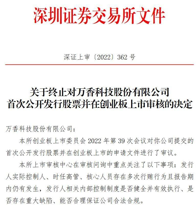 2020年12月,万香科技提交的创业板IPO申请获深交所受理。2022年,上市委员会审议未通过,对万香科技首次公开发行股票并在创业板上市申请予以终止审核。原因是2005—2019年,公司的实际控制人、时任高管、核心技术人员涉及9项行贿事项,且报告期内仍有发生,不符合相关规定。