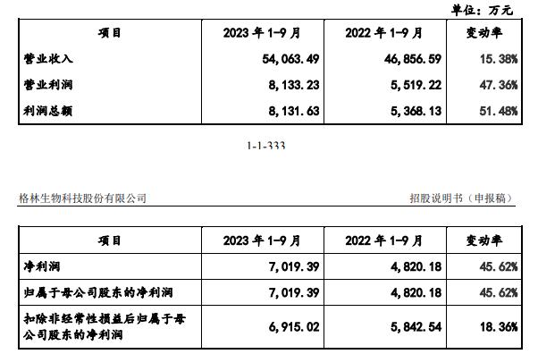 招股书显示,格林生物在2023年前9个月共实现营收5.41亿元,同比上涨15.38%;营业利润同比上涨47.36%至0.81亿元,净利润同比上涨45.62%至0.7亿元。公司净利润增速快于收入增速,主要是因为随着上游原材料价格回落,公司原材料成本有所下降,此外,甲位突厥酮、突厥体烯酮等突厥酮系列高附加值产品销售收入增加,从而毛利率增加所致。