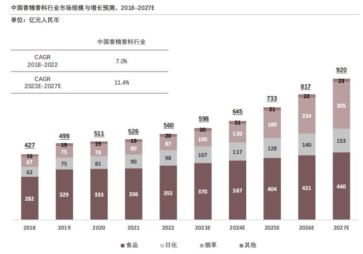 《2023年中国香精香料行业发展白皮书》中指出,中国香精香料化妆品市场规模仅从2018年的427亿元规模增长到2022年的560亿元,复合年增长率为7%。不过该市场未来增长潜力巨大,预计2027年将达到920亿元规模,年复合增长率达11.4%。
