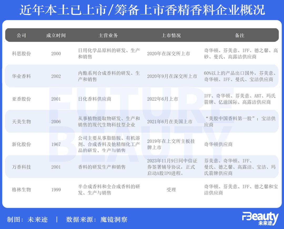 据《FBeauty未来迹》不完全统计,2019年开始,新化股份、科思股份、华业香料、天美生物、亚香股份5家公司成功上市,万香科技、格林生物在今年筹备上市。其中,新化股份是奇华顿供应商,华业香料、科思股份、亚香股份、万香科技、格林生物是“四大”的原料供应商。