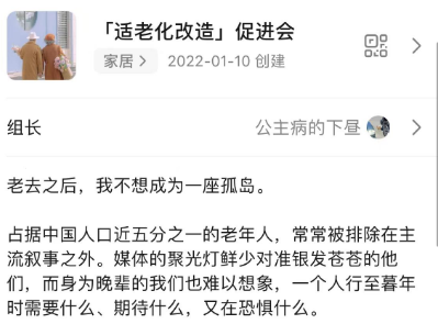 在豆瓣“适老化改造促进会”小组的简介上,赫然写着这样一句话:老去之后,我不想变成一座孤岛。做适老家居,不仅是相关企业、品牌抓住趋势为自己谋利的一步,更是为老年人营造更好养老环境的重要一步。