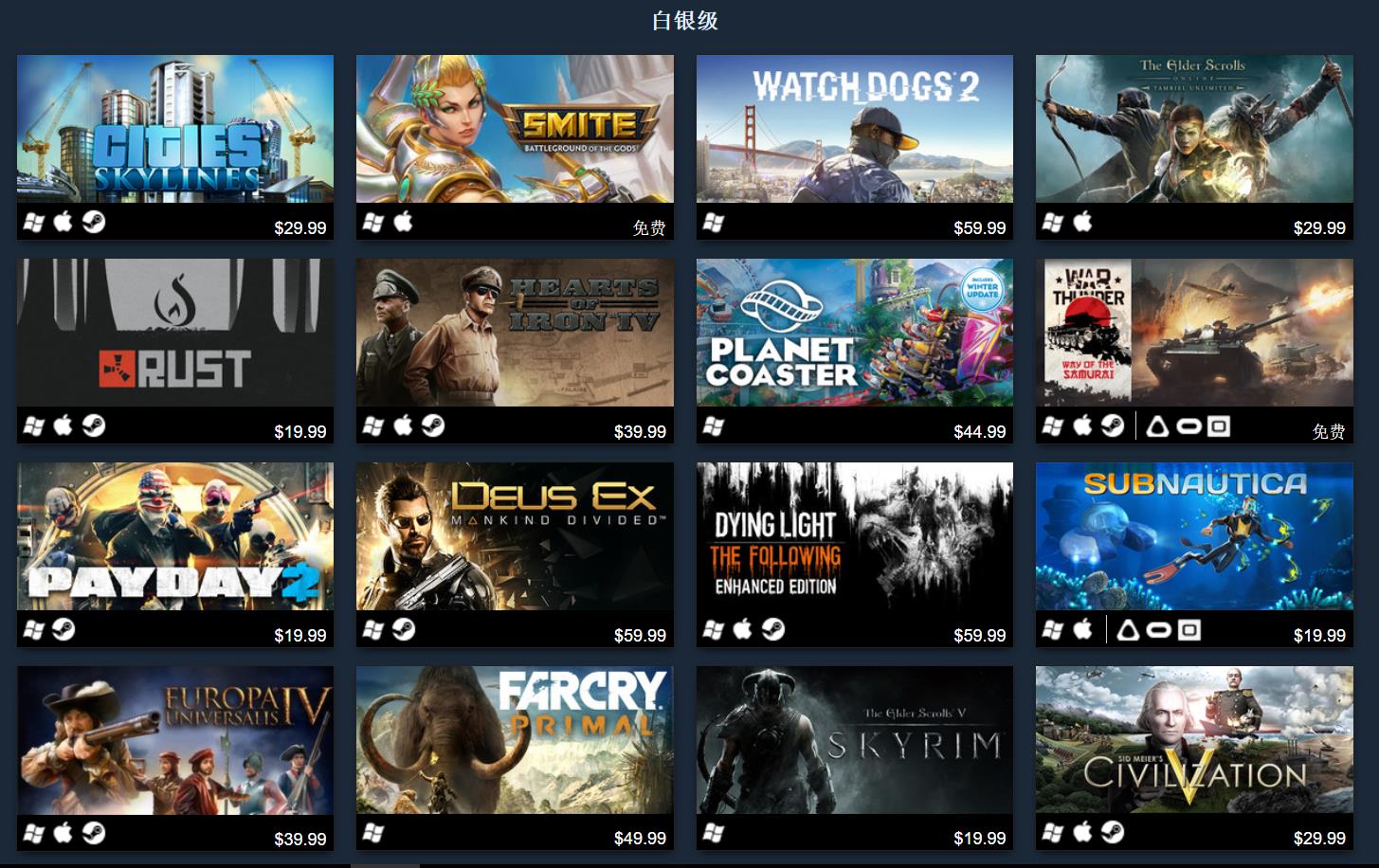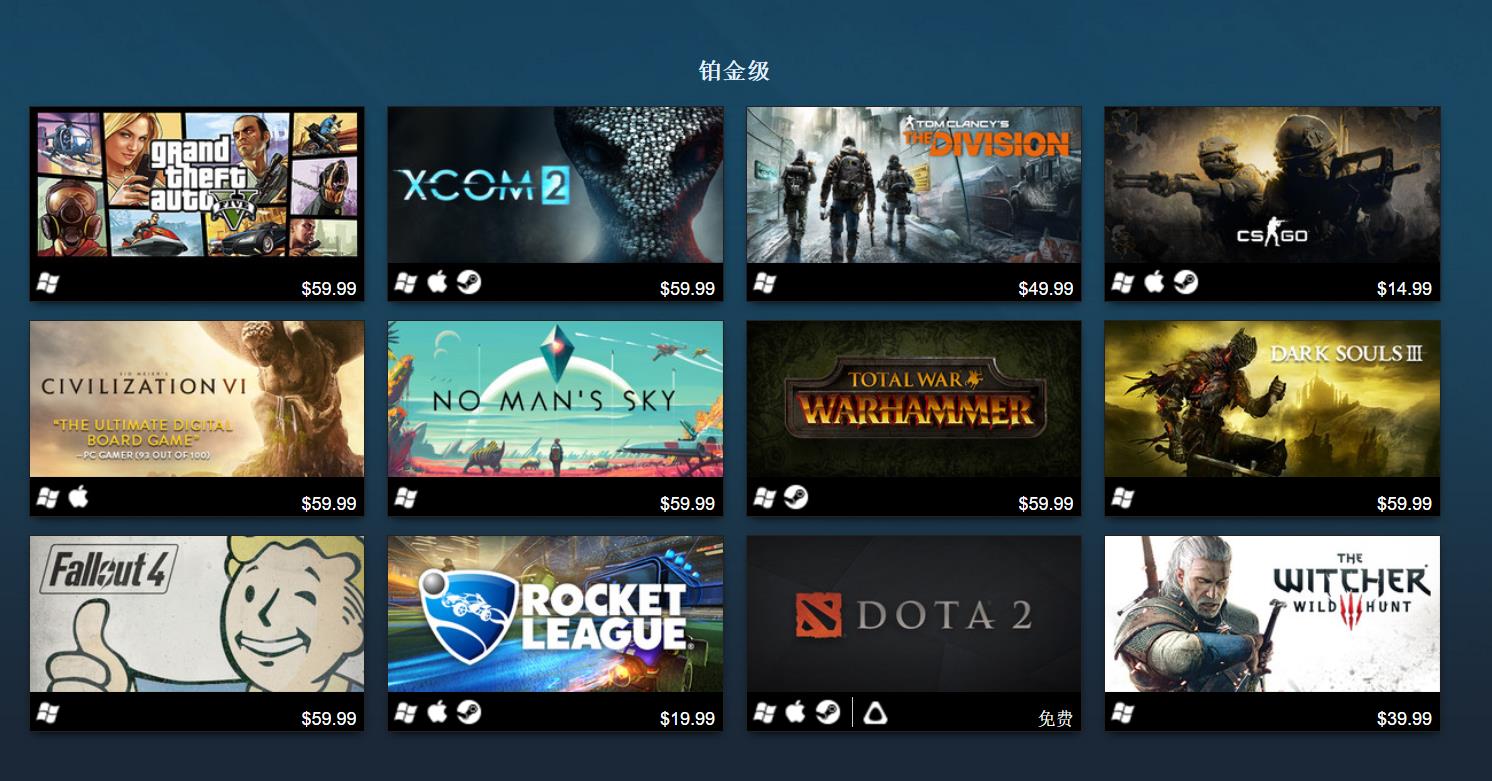 铂金级游戏就是2016年一整年的最热门游戏了,例如《侠盗猎车手5》,凭借无可非议的品质,仍然不时在去年占据Steam游戏销量榜的第一名,而同属于开放世界的《辐射4》和《巫师3》虽然是去年的作品,但依然在今年延续了热度,尤其是《巫师3》,凭借扩展包《血与酒》还获得了年度最佳RPG的桂冠。