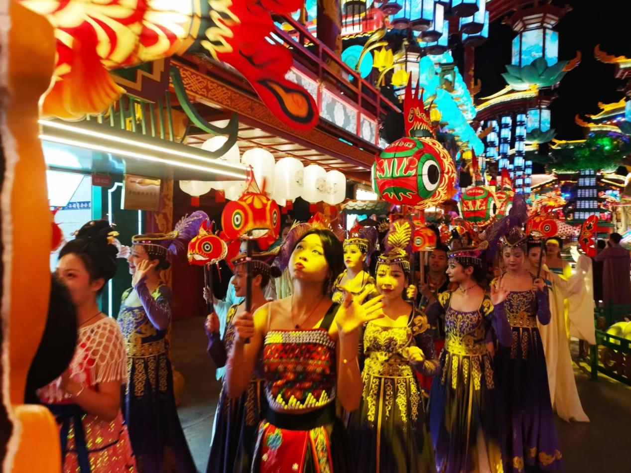 如果说国风建筑是硬实力。那么从电音气球泼水节、泡泡渔灯节、国风拜月大典、红旗飘飘节……到眼下正在举办的渔灯火把节以及即将开启的山海异兽花灯节。这一些大手笔的投入,将华夏传统节庆文化,少数民族节庆与青岛本土相融合碰撞,通过不断地创新节目形式持续点燃着胶州湾这片曾经的盐场滩涂。