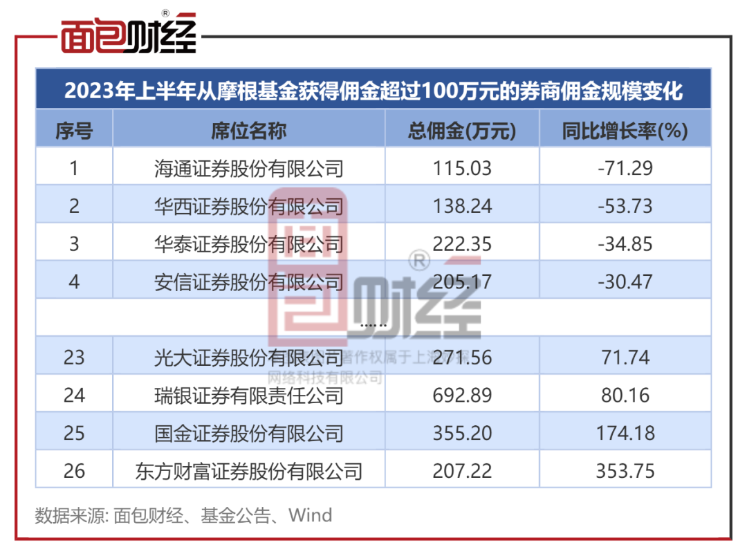 从佣金变化趋势来看,2023年上半年,东方财富证券、国金证券从摩根基金获得的佣金快速上升,而海通证券、华西证券、安信证券等机构同期从摩根基金获得的佣金同比降幅较大。