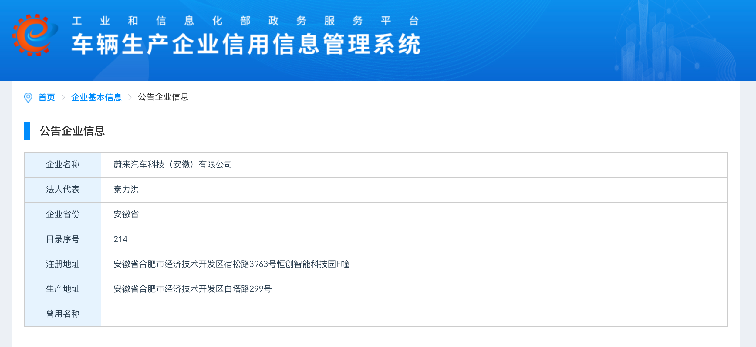 12月4日,经查询,蔚来汽车科技(安徽)有限公司出现在工信部的“车辆生产企业信用信息管理系统”中。