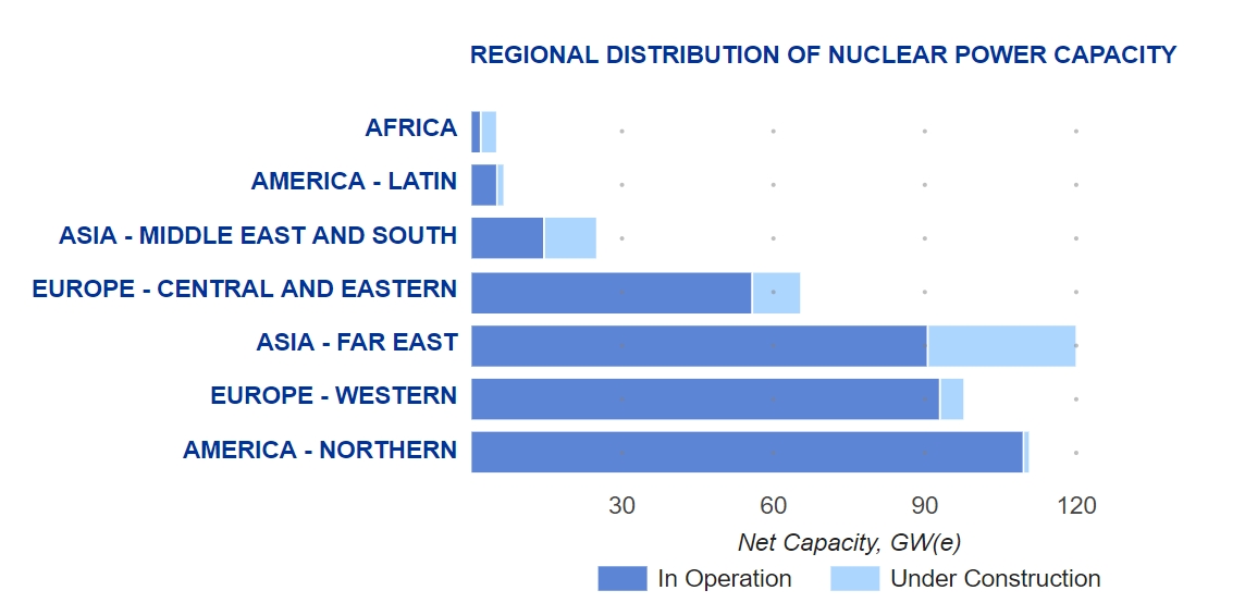 IAEA数据显示,当前拥有最多核反应堆的国家为美国、法国、中国、俄罗斯和韩国,分别在运核反应堆93座、56座、55座、37座和25座。