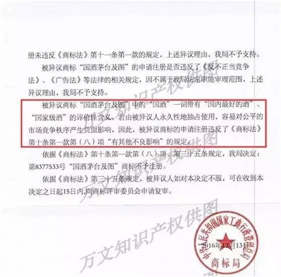 国家商标局却认为,被异议商标为“国酒茅台及图”中的“国酒”一词带有“国内最好的酒”、“国家级酒”的评价性含义,若由被异议人永久性地独占使用,容易对公平的市场竞争秩序产生负面影响,因此,被异议商标的申请注册违反了商标法第十条第一款第(八)项“有其他不良影响”的规定。