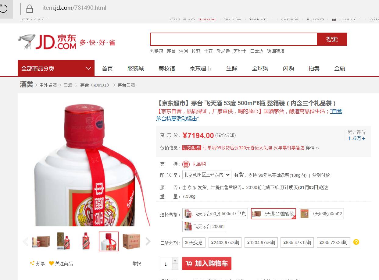 1月2日,《财经啸侃》特约、独家撰稿人五谷君登陆京东商城官网,输入“茅台”二字进行搜索,一系列关于茅台产品信息映入眼帘,点开飞天茅台页面一看,令人大跌眼镜。