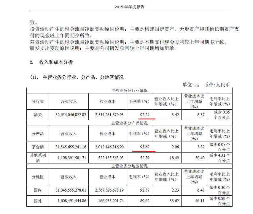 2015年年度报告显示,贵州茅台酒类业务毛利率高达92.24%,其中茅台酒业务毛利率更是逼近94%,羡煞众人。