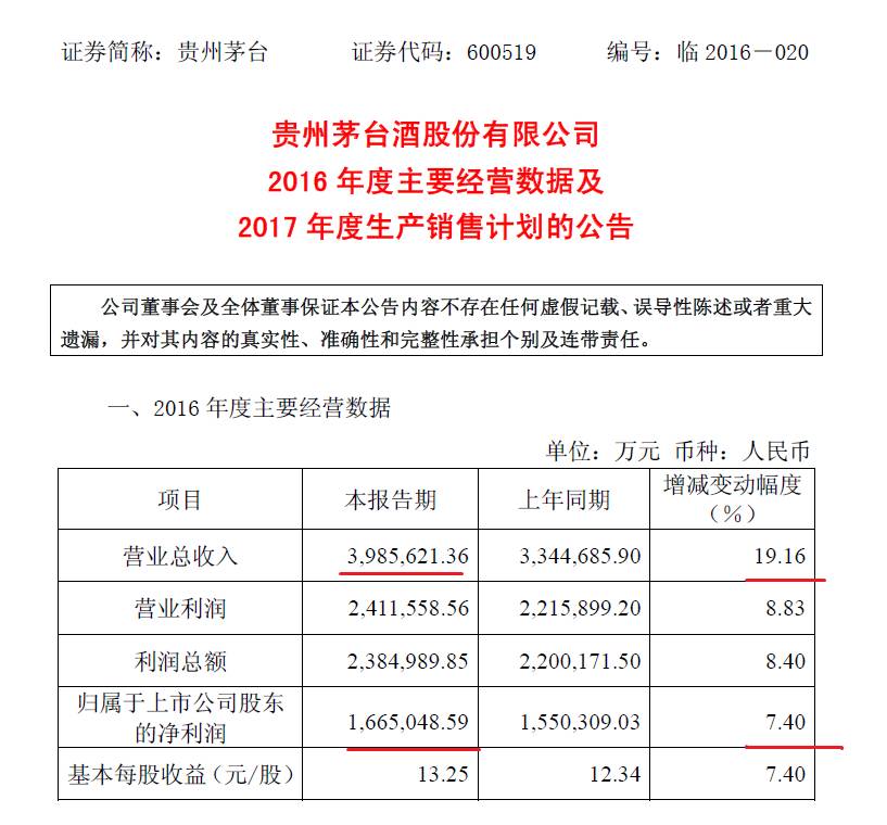 日前,贵州茅台发布2016年度主要经营数据,预计全年实现营业总收入约为398.56亿元,同比增长19%;归属于上市公司股东的净利润约为166.5亿元,同比增幅7%左右。