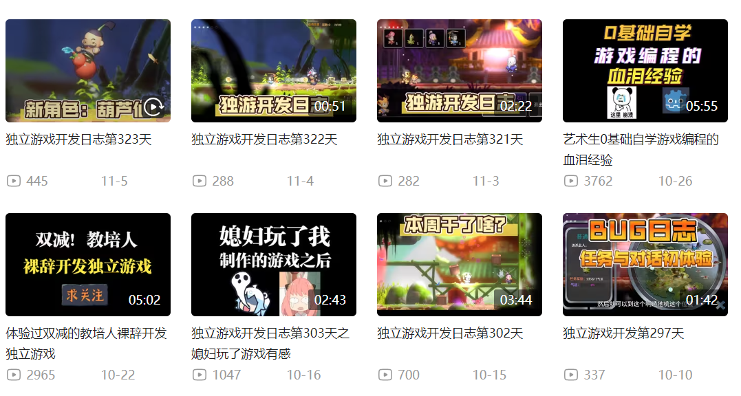 在B站上,茶馆以“开发游戏”为关键词进行搜索发现,确有不少独游制作人UP主 。比如,“混沌之神虚妄喵”(16.6万粉丝),“可布和常常诶”(14.4万粉丝),“AliveGameStudio”(32.3万粉丝),“在下火龙狗”(11.4万粉丝)等等。