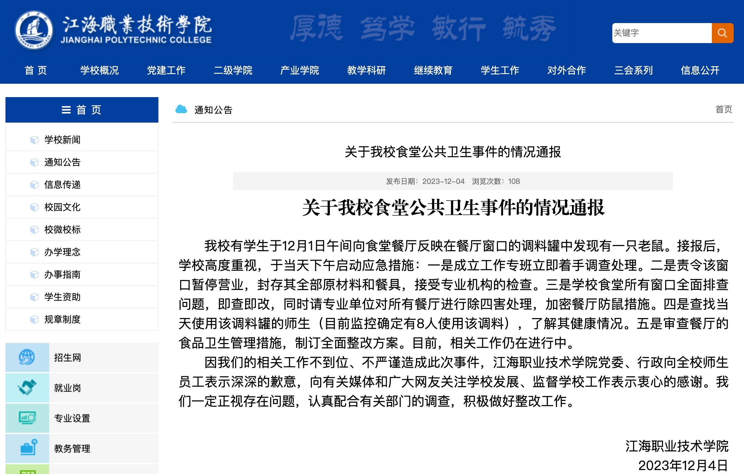 12月4日,江海职业技术学院发布《关于我校食堂公共卫生事件的情况通报》:我校有学生于12月1日午间向食堂餐厅反映在餐厅窗口的调料罐中发现有一只老鼠。接报后,学校高度重视,于当天下午启动应急措施:一是成立工作专班立即着手调查处理。二是责令该窗口暂停营业,封存其全部原材料和餐具,接受专业机构的检查。三是学校食堂所有窗口全面排查问题,即查即改,同时请专业单位对所有餐厅进行除四害处理,加密餐厅防鼠措施。四是查找当天使用该调料罐的师生(目前监控确定有8人使用该调料),了解其健康情况。五是审查餐厅的食品卫生管理措施,制订全面整改方案。目前,相关工作仍在进行中。